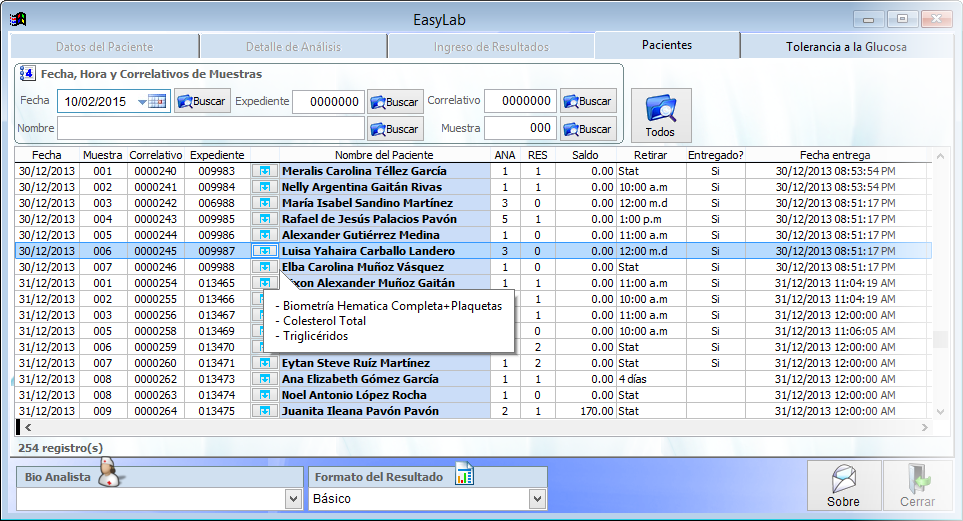 para apoyar el control e impresión e historial de RESULTADOS DE ANALISIS CLINICOS.